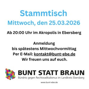 Zusammenschluss von Bürger*innen, die rechtsextremen Gedankengut und Umtrieben im Landkreis Ebersberg entgegen treten. Das Bündnis organisiert mit seinen ehrenamtlich Aktiven Vorträge, Konzerte, Theaterstücke und Demonstrationen.